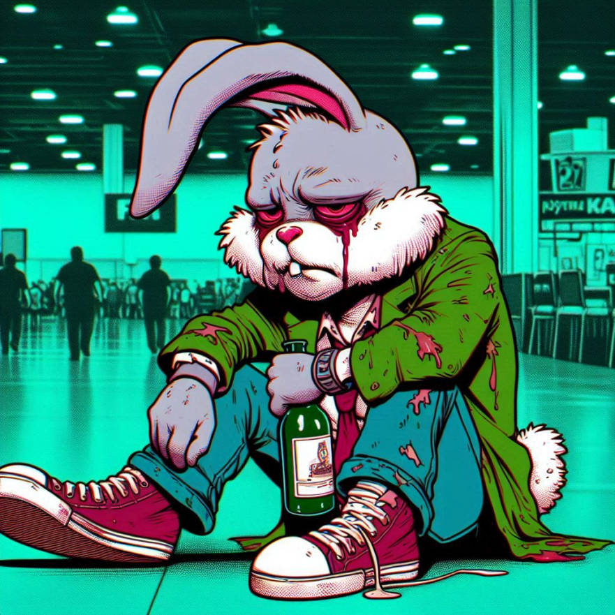 “That whole egg bullshit nearly put me out of business,” the large six-foot white rabbit said while sitting at a Comic Con bar sipping a cold nonalcoholic beer. “Not to mention the bird flu’s effect on my chickens. They’re all still scared to death… wearing masks… and they’re not mating. I need more chickens for production, but no one wants to get F’d by bird flu.”