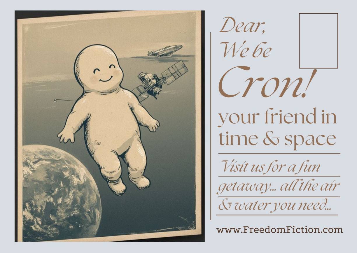 The Cron retired to their home places, leaned back in their gigantic curved chairs, and clasped their four arms across their taunt bellies, now good for another three long years. They dreamed in hope of other ships coming from distant planets before three more Cron years had passed.
